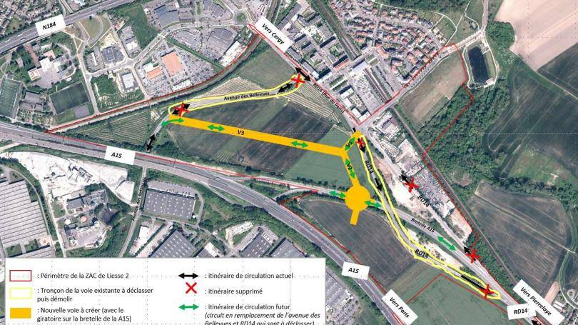 - RD14 en direction de Saint-Ouen-l’Aumône : réaménagement de la RD14 en voie verte à dominante cyclable et piétonne. Ainsi le trafic automobile venant de Pierrelaye pour Saint-Ouen-l’Aumône empruntera désormais la bretelle actuelle d’accès à l’autoroute puis les voies V2-V1 via le giratoire à créer sur la bretelle, pour regagner la Rue de Paris (RD14).