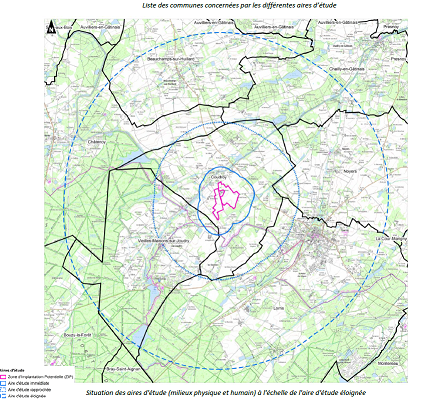 Plusieurs aires d’étude ont été définies autour de la zone d’implantation potentielle (ZIP) du parc agrivoltaïque. Ainsi, les huit communes suivantes sont situées dans le rayon de 5 km autour de la ZIP : Beauchamps-sur-Huillard, Bouzy-la-Forêt, Chailly-en-Gâtinais, Châtenoy, Coudroy, Lorris, Noyers, Vieilles-Maisons-sur-Joudry. Cette ZIP concerne deux secteurs implantés sur la commune de Coudroy et séparés par la route communale de la Ronce : le secteur ouest de 18 ha et le secteur est de 32 ha.
