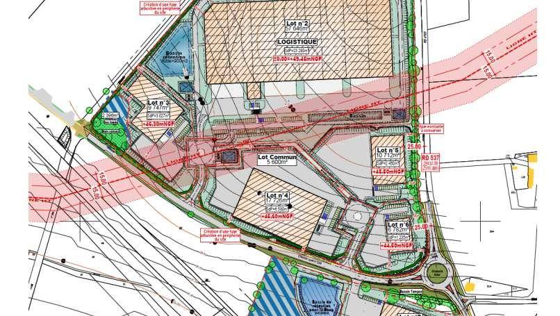 Le terrain d’assiette du projet représente 15,7 ha. L’aménagement projeté comprend 7 lots de 6 000 à 58 000 m² ainsi que la mise en œuvre des voiries et réseaux nécessaires.